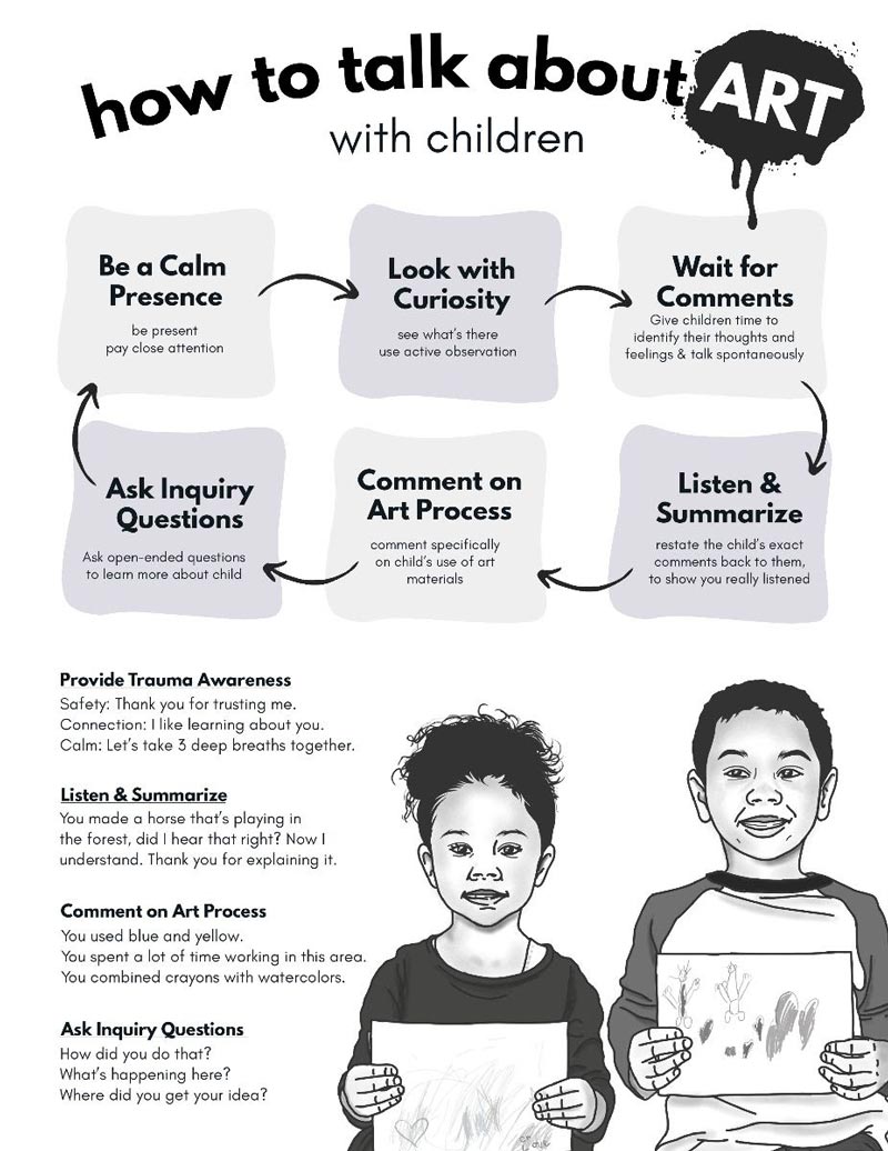 Active listening and all forms of empathy take a big role in trauma-informed care. How to apply these principles is illustrated in How to Talk About Art with Children, one of over 100 graphics & drawings in my new book, Trauma Informed Art Activities for Early Childhood, published just last month by Jessica Kingsley Publishers.